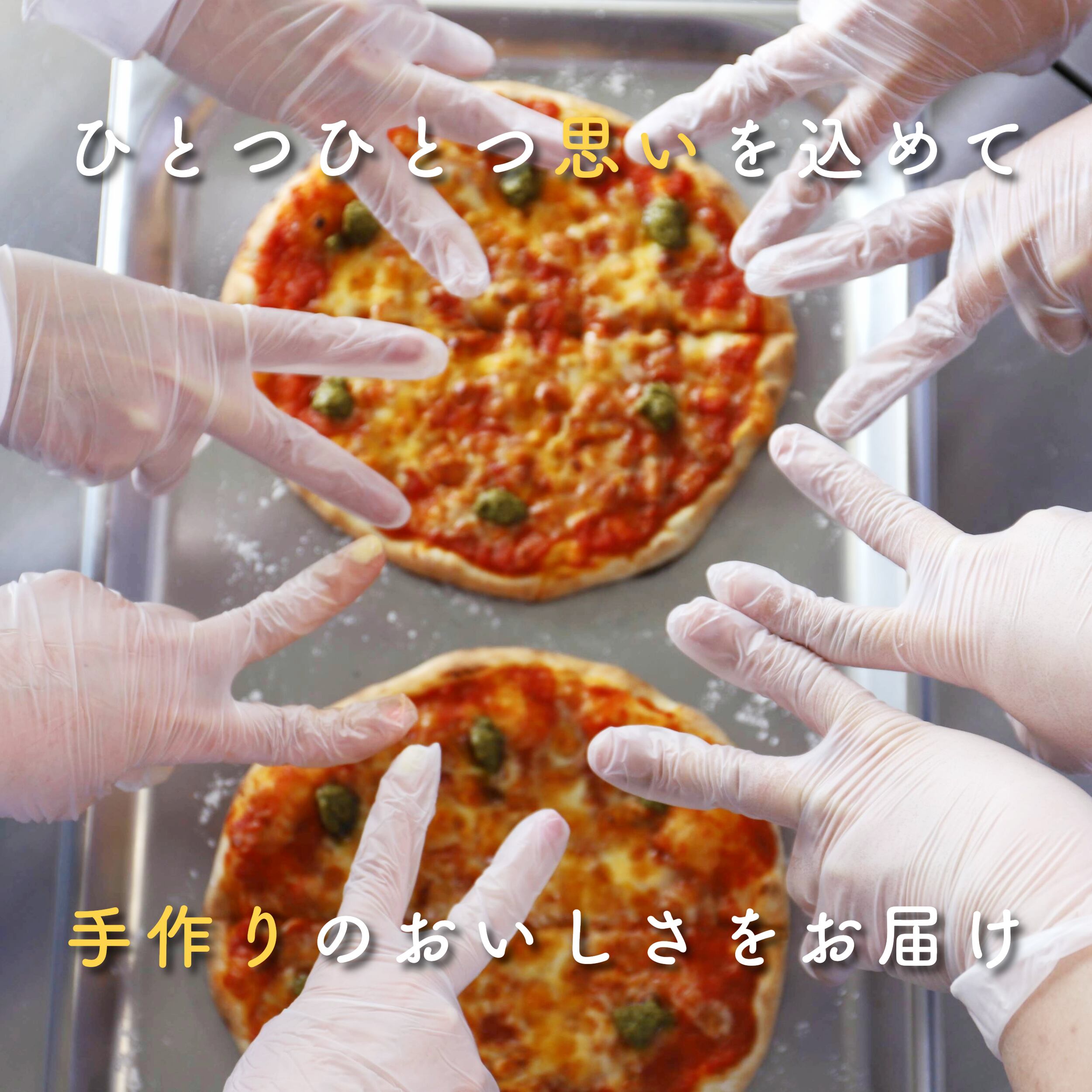 おいしい生地・ソース作りにこだわり、全てを手作りで仕上げた冷凍ピザです。ライフデザインの利用者の皆さんが、ピザ生地をこねたり伸ばしたりと、難しい作業に何度も挑戦して完成させた手作りの自信作です!