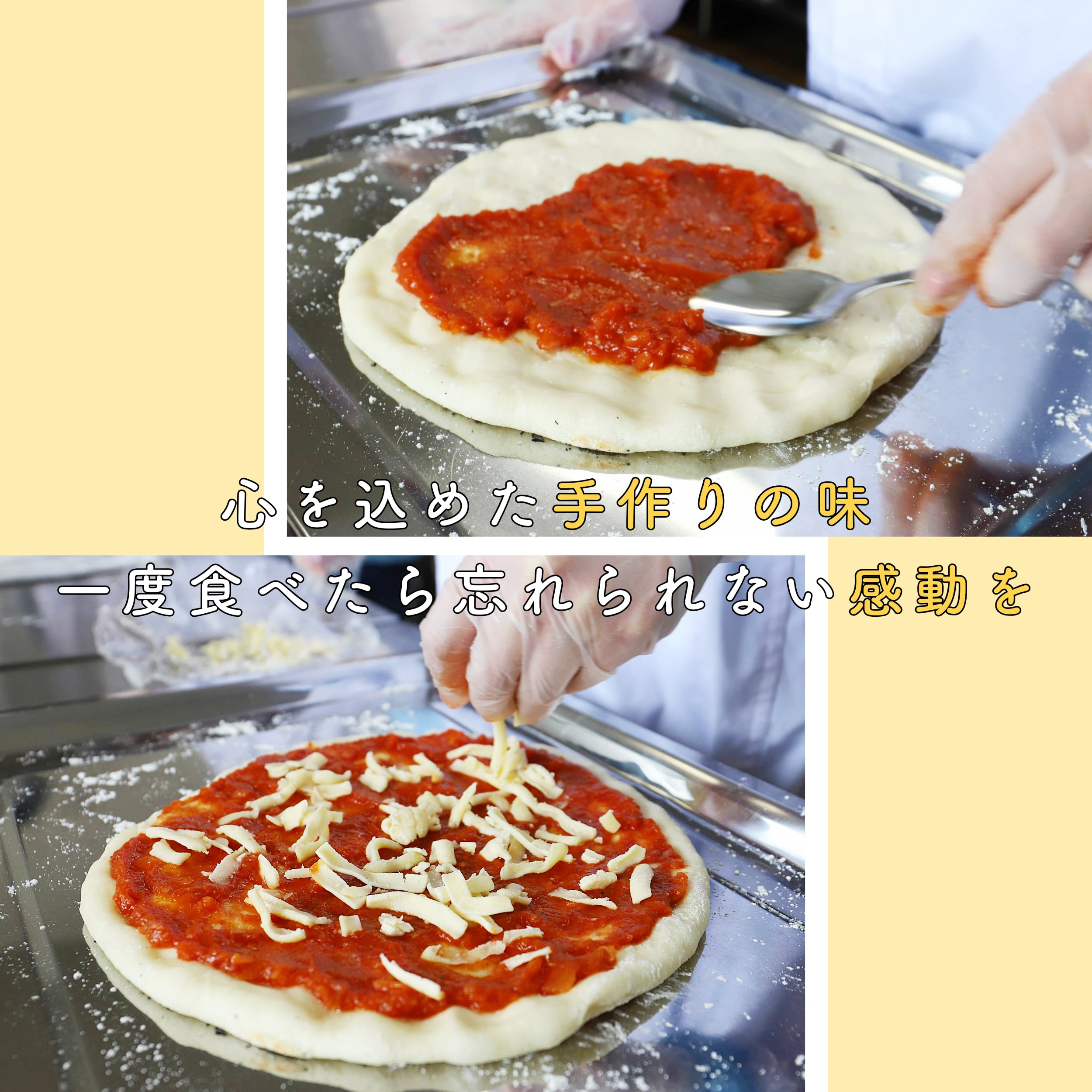 おいしい生地・ソース作りにこだわり、全てを手作りで仕上げた冷凍ピザです。ライフデザインの利用者の皆さんが、ピザ生地をこねたり伸ばしたりと、難しい作業に何度も挑戦して完成させた手作りの自信作です!